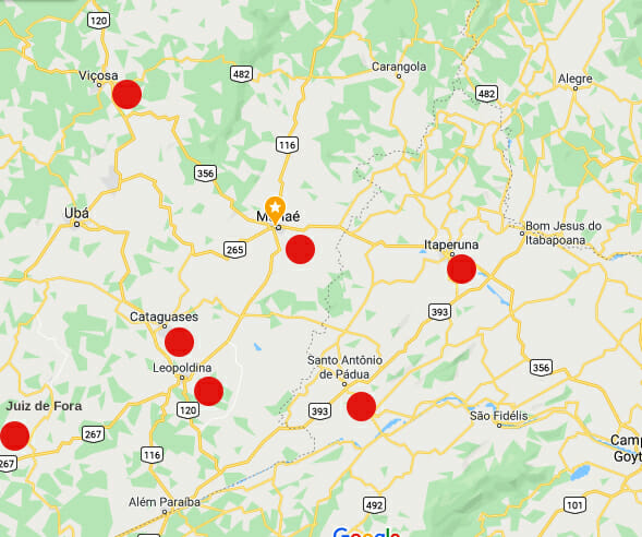 Muriaé, MG – Itaperuna, RJ – Juiz de Fora, MG – Viçosa, MG – Cataguases, MG – Leopoldina, MG – Santo Antônio de Pádua, RJ